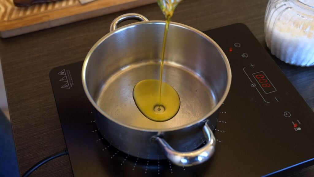 Num tacho médio, aqueça 1 colher de sopa de azeite em lume médio.