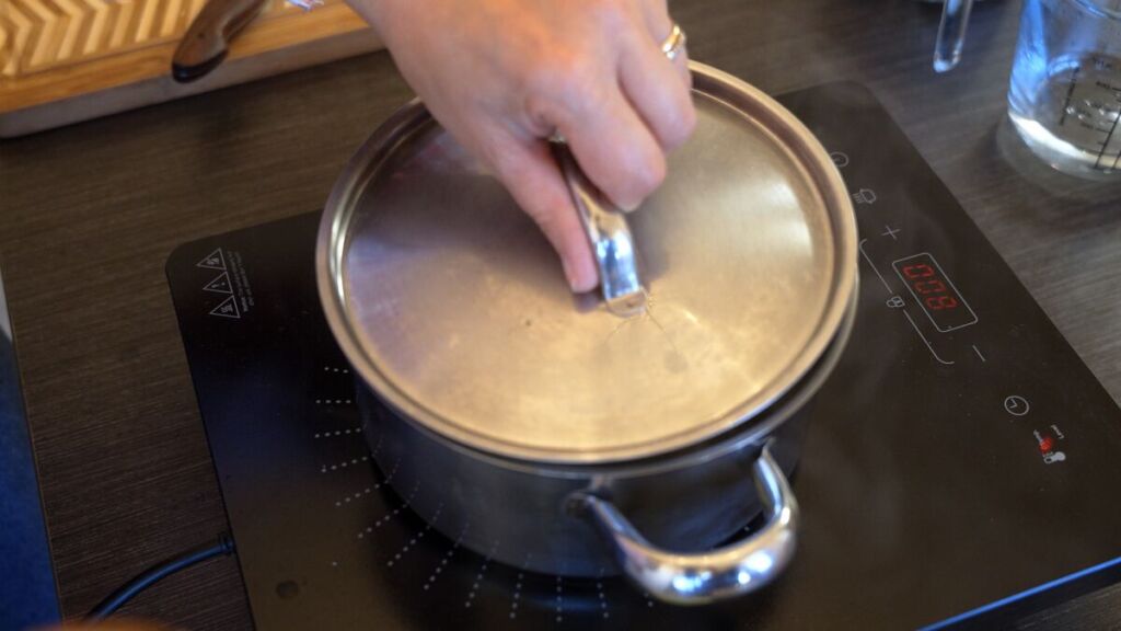 Verta a água fria, tempere com sal e mexa uma vez. Quando levantar fervura, baixe o lume para o mínimo, tape o tacho e coza 12 a 15 minutos, sem mexer.