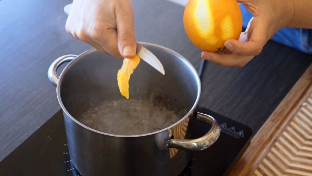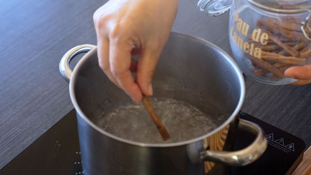 Num tacho médio, coloque 750 ml de água, 2 paus de canela, 2 cascas de laranja (só a parte alaranjada, sem a branca que é amarga) e uma pitada de sal.