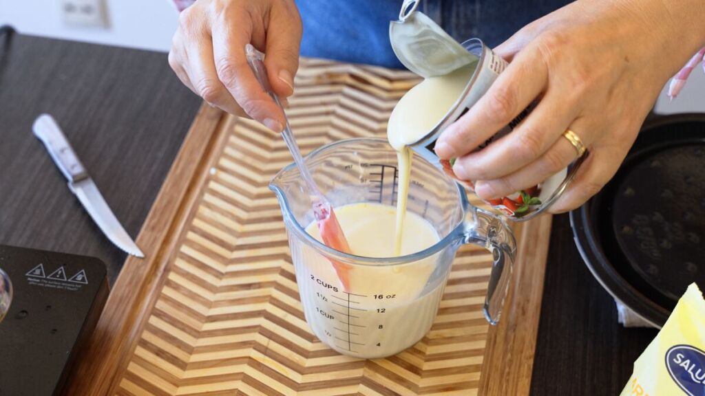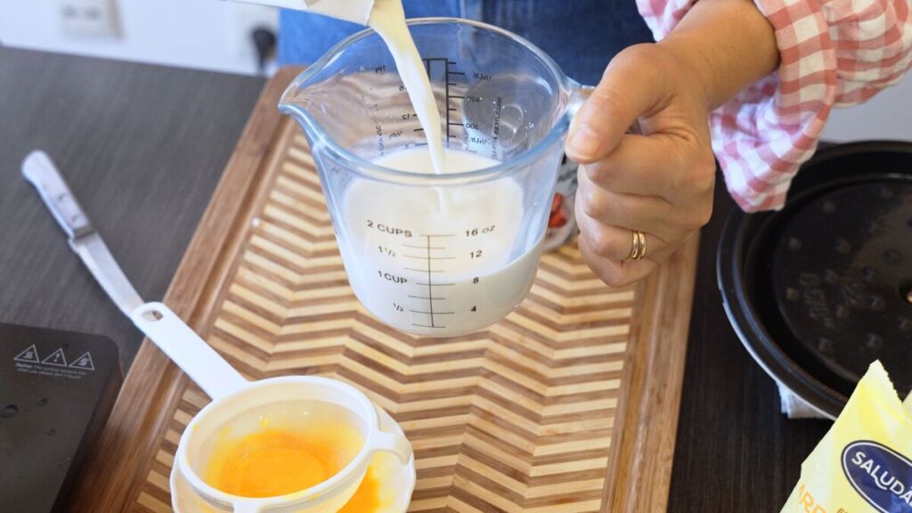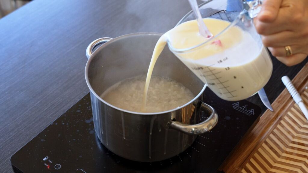 Enquanto o arroz coze, prepare a base cremosa. Numa tigela, junte 500 ml de leite meio gordo, ½ lata de leite condensado e 4 gemas passadas por um coador fino (para eliminar grumos).