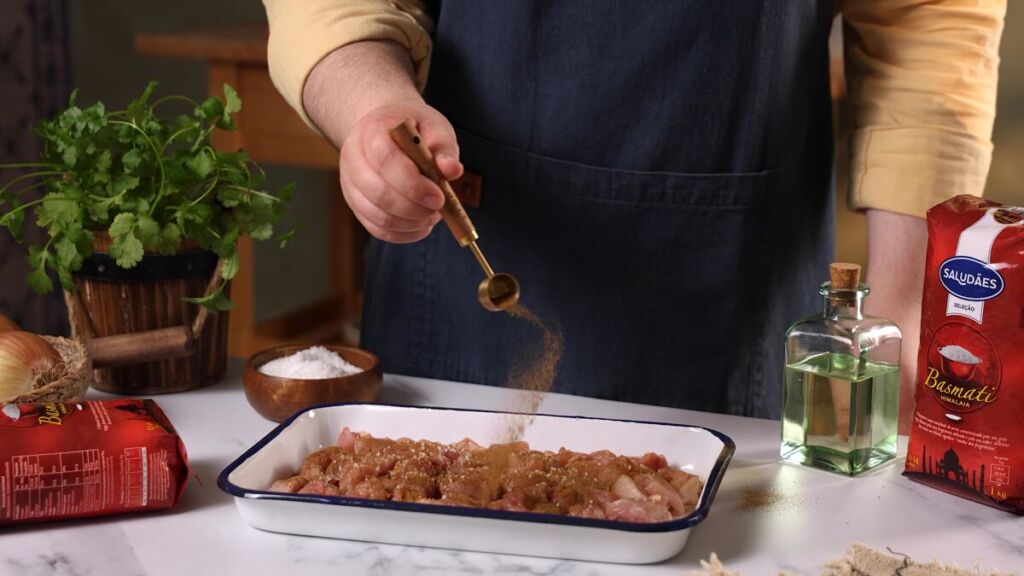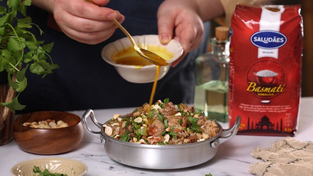 Descubra cada etapa desta receita no nosso vídeo exclusivo, onde mostramos os truques essenciais para um arroz indiano perfeito. Verá como preparar as especiarias corretamente, como cozinhar o frango para máxima suculência e como obter arroz com grãos soltos e aromáticos.