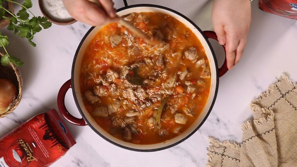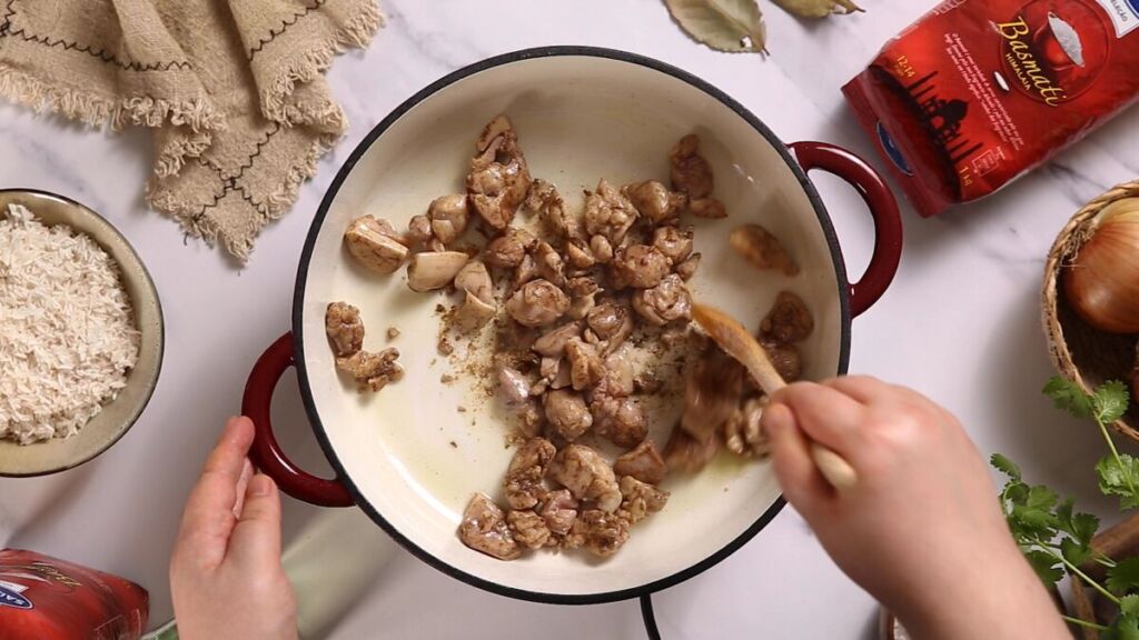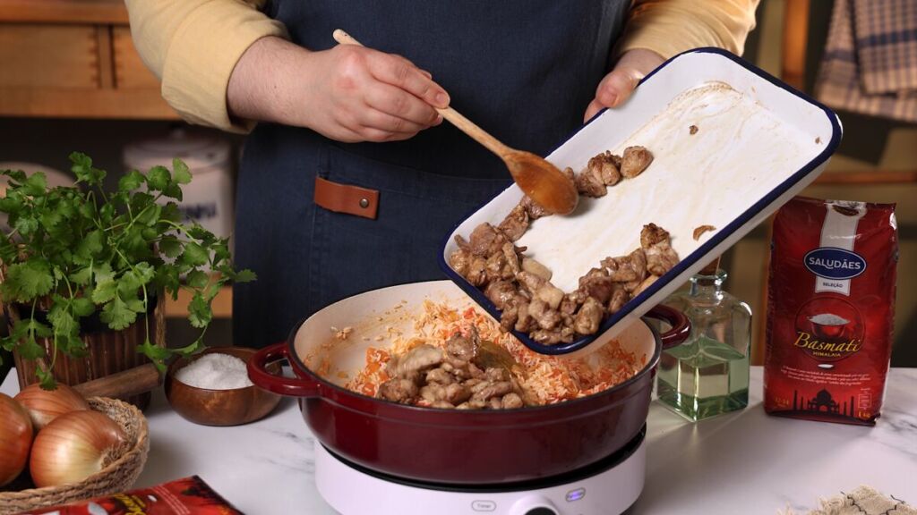 Adicione o Arroz Basmati Saludães ao refogado e misture bem para incorporar todos os sabores. Junte o frango dourado e envolva suavemente. Adicione a água quente e misture bem.