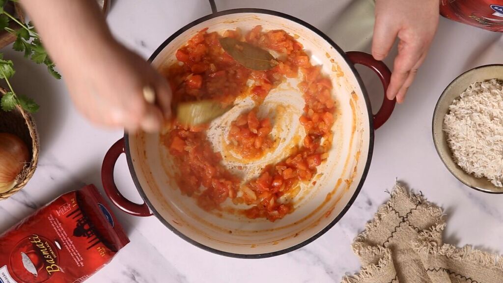 Junte o tomate, o cardamomo moído, as folhas de louro e tempere com uma pitada de sal. Deixe cozinhar por cerca de 4 minutos e amasse os pedaços de tomate de vez em quando com a espátula para que se desmanchem.