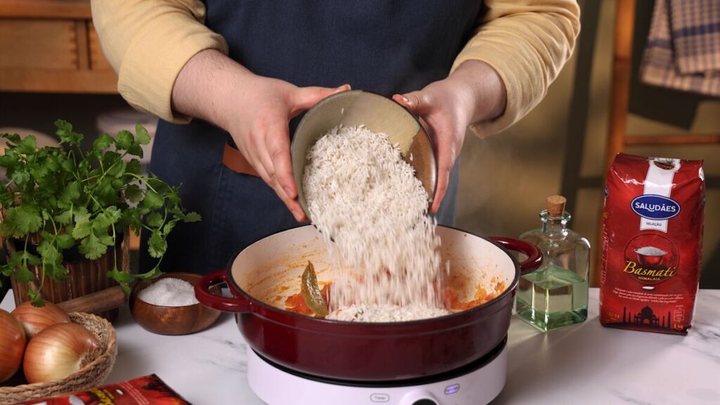 O Arroz Basmati Saludães é ideal para esta receita graças à sua textura solta e aroma característico. Ao contrário de outros tipos de arroz, o basmati alonga durante a cozedura e mantém os grãos separados