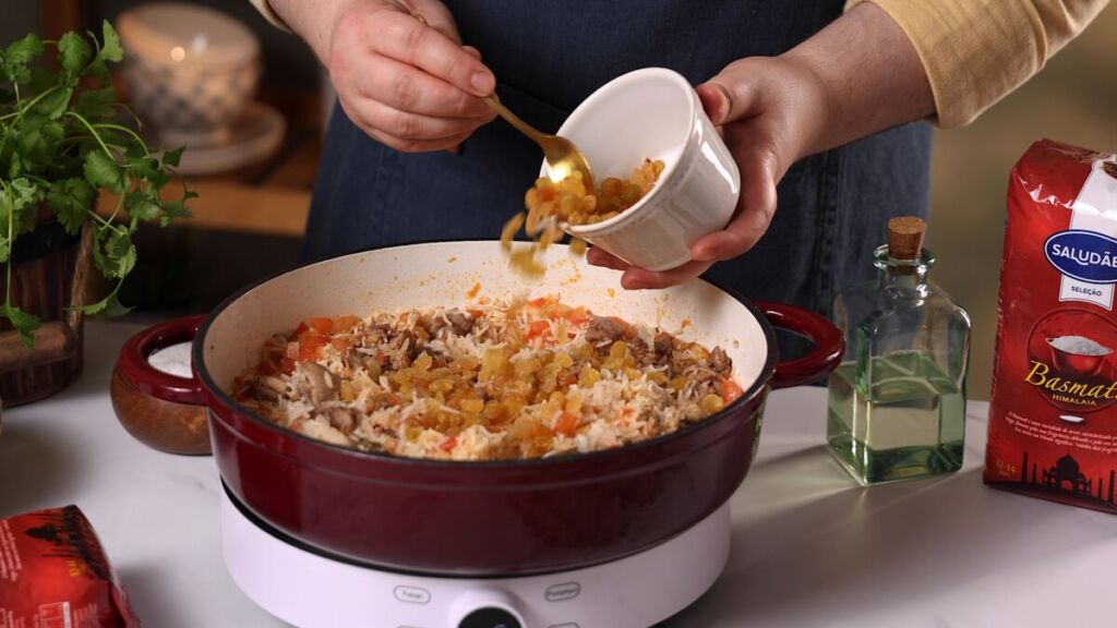 Dica essencial: Assim que começar a ferver, reduza o lume e tape parcialmente a frigideira. Deixe cozer por 20 minutos, ou até que toda a água seja absorvida. Quando a água secar, desligue o fogo, adicione as passas e deixe repousar por 5 minutos. Finalize com manteiga de cúrcuma, castanhas-de-caju torradas e coentro fresco. Para mais técnicas de finalização, consulte a nossa receita de arroz de bacalhau com grelos.