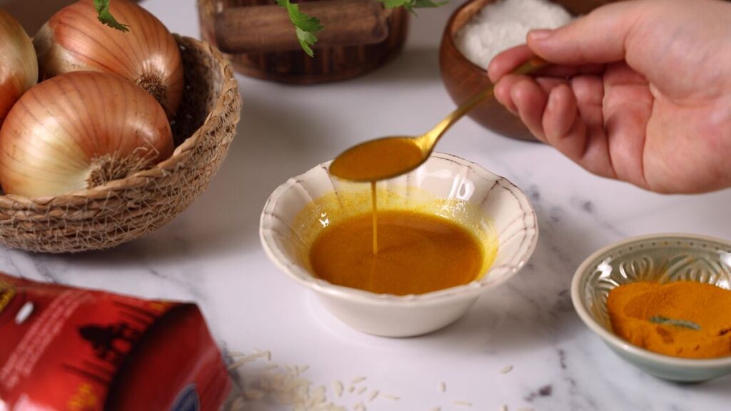 Dica profissional: A cebola frita é um elemento-chave que adiciona um elemento crocante e sabor ao prato. Para obter resultados profissionais, use óleo quente mas não fumegante e frite em pequenas quantidades para garantir um dourado uniforme. Para mais técnicas de fritura, consulte a nossa receita de solha frita com arroz de tomate.