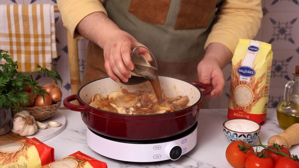 O arroz é um dos protagonistas desta receita, por isso vale a pena dedicar alguma atenção extra para realçar o seu sabor. Em vez de utilizar apenas água para cozer o arroz, considere substituir parte do líquido por caldo de galinha caseiro. Este simples truque adiciona uma profundidade de sabor incomparável.