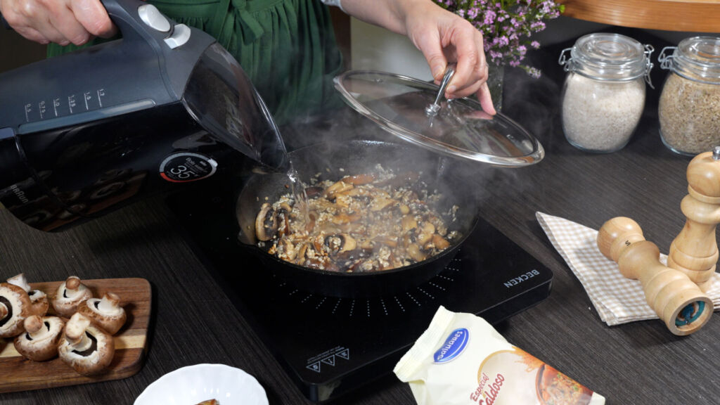 Pode substituir a água por caldo de legumes. O caldo de legumes adiciona uma profundidade de sabor extra ao risoto, intensificando o gosto umami dos cogumelos. Além disso, o caldo contribui para uma textura mais cremosa e um sabor mais rico no prato final.